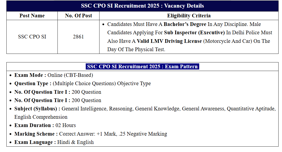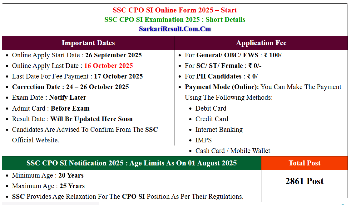 Staff Selection Commission (SSC), The notification for the recruitment of Delhi Police SI and CAPF ASI Exam 2025 Recruitment has released on the official website. this recruitment has 2861 positions. The SSC application form has started on 26 September 2025, and candidates can apply until 16 October 2025. The minimum age is 25 Years & the maximum age is 25 years as of August 01, 2025. Candidates must check the complete details for the SSC CPO SI Recruitment 2025 provided below.