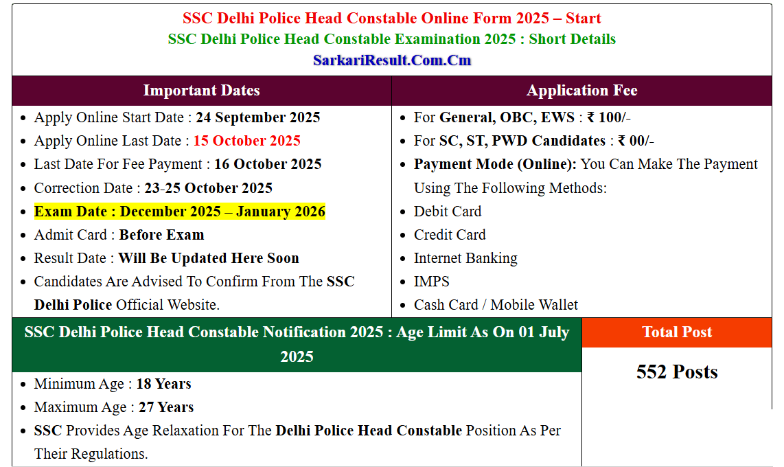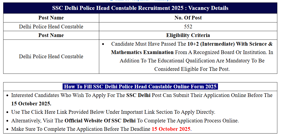 Staff Selection Commission (SSC Delhi Police), has released a notification on official website for the recruitment of Delhi Police Head Constable Post. This recruitment is for 552 positions. Delhi Police Application Form has started on 24 September 2025 & the candidates can apply till 15 October 2025. Candidates must check the complete details for SSC Delhi Police Head Constable Recruitment 2025 which has given below.
